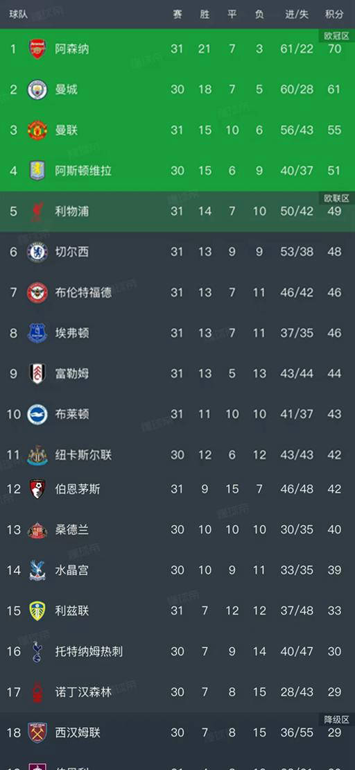 英超最新排名更新:利物浦败北,切尔西惨遭重创,曼联稳居第三